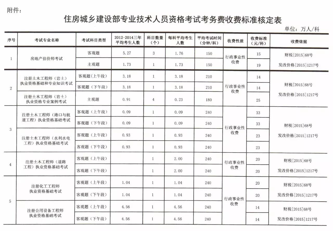 附件:住房城乡建设部专业技术人员资格考试考务费收费标准核定表